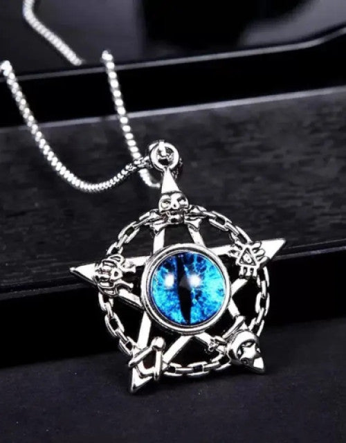 Men Stainless Steel Pentacle Star Evil Eye Skull Pendant Necklace Blue Eye